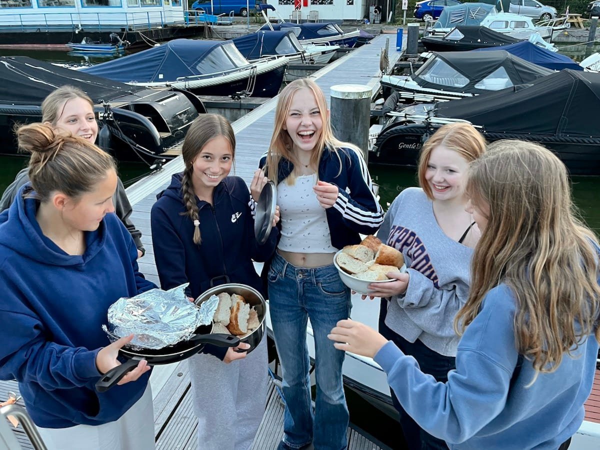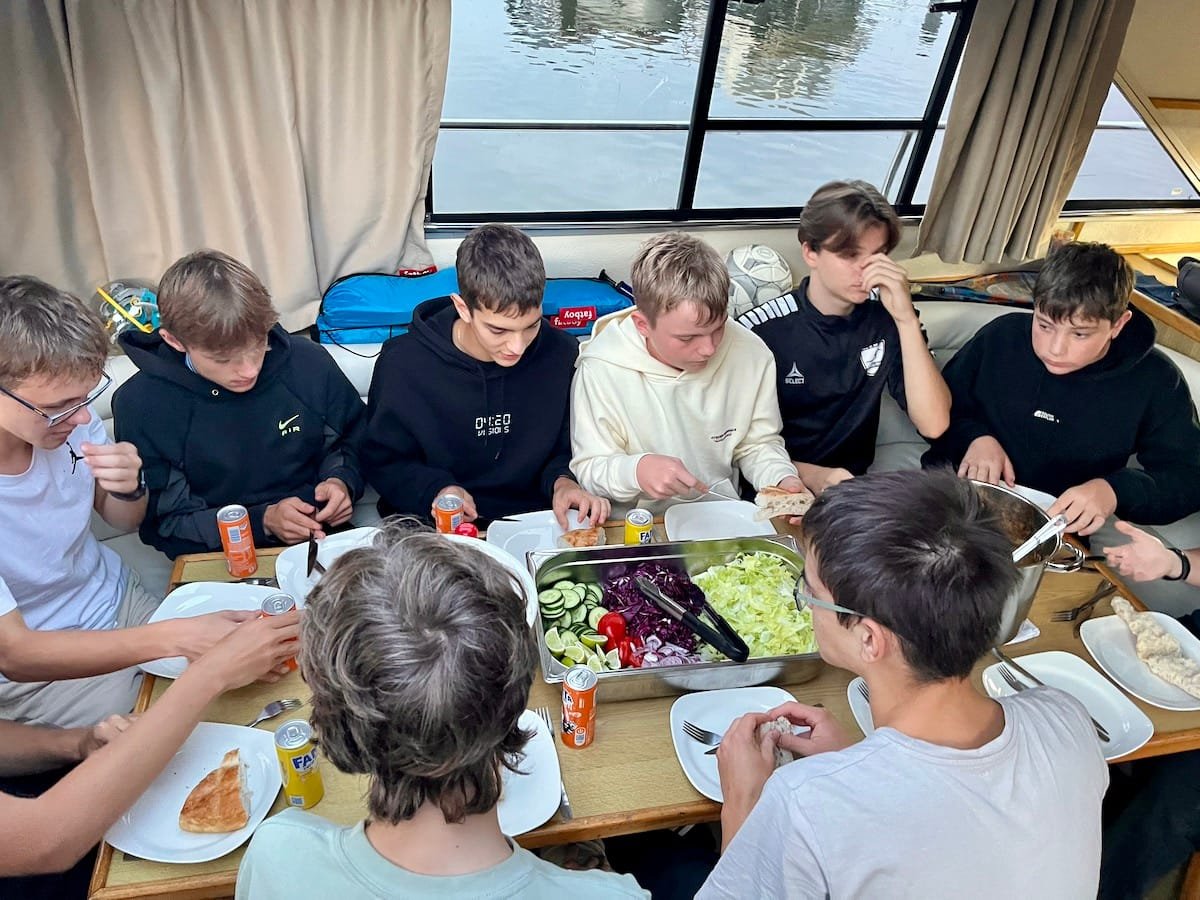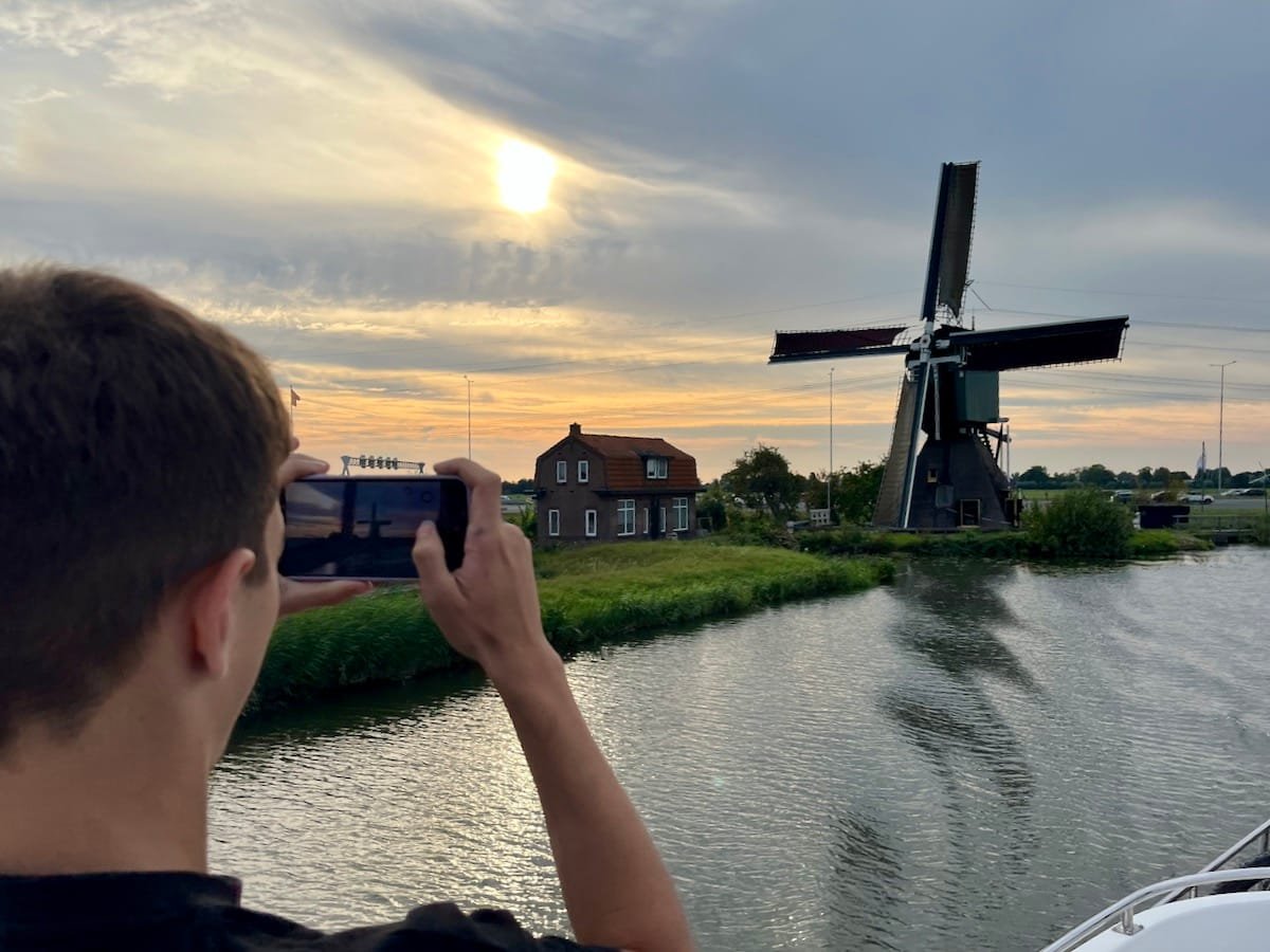 Der heutige Tag begann mit einer kleinen Verspätung: Unser Reisebus startete erst mit 30 Minuten Verzögerung in Manching. Aber das tat der Vorfreude keinen Abbruch! Um 15:15 Uhr erreichten wir endlich Vinkeveen. Nach einem kurzen Theorieunterricht und einer aufregenden Fahrprobe hieß es dann: Leinen los! Um 17:30 Uhr starteten wir mit unseren beiden Hausbooten. Bei einem wunderschönen Sonnenuntergang fuhren wir über kleine und große Kanäle an einer malerischen Windmühle zu unserem ersten Zwischenstopp im Hafen Veesp. Zum Abendessen gab es leckere Dönerteller – ein perfekter Start für unser Hausboot-Abenteuer in den Niederlanden!