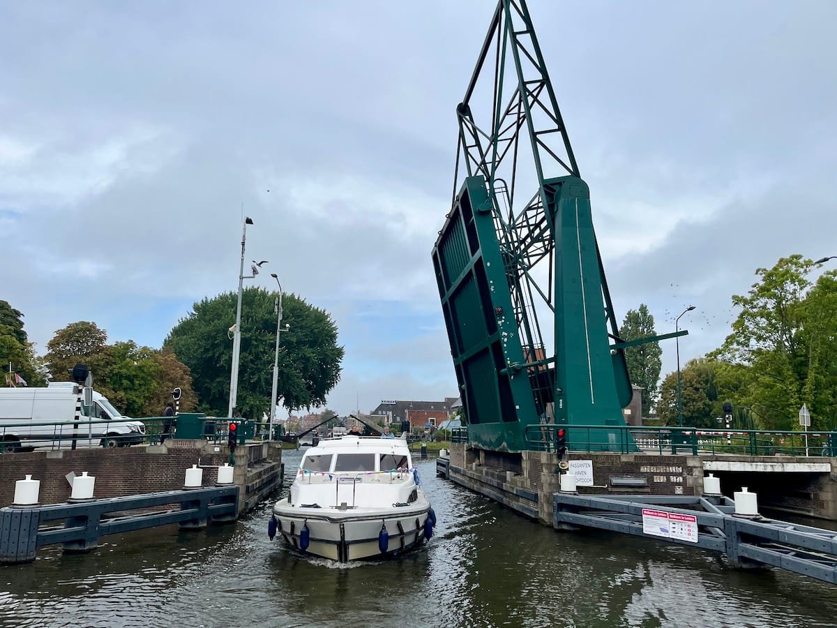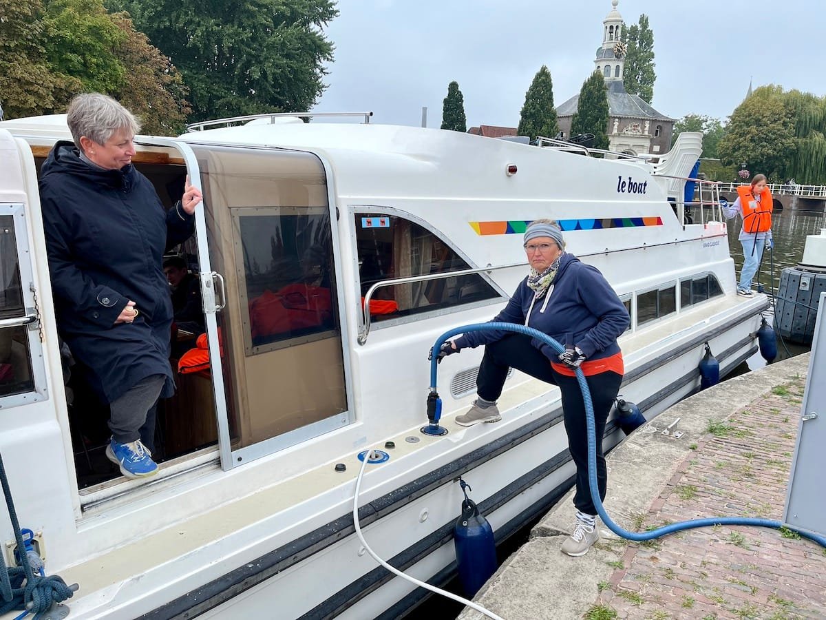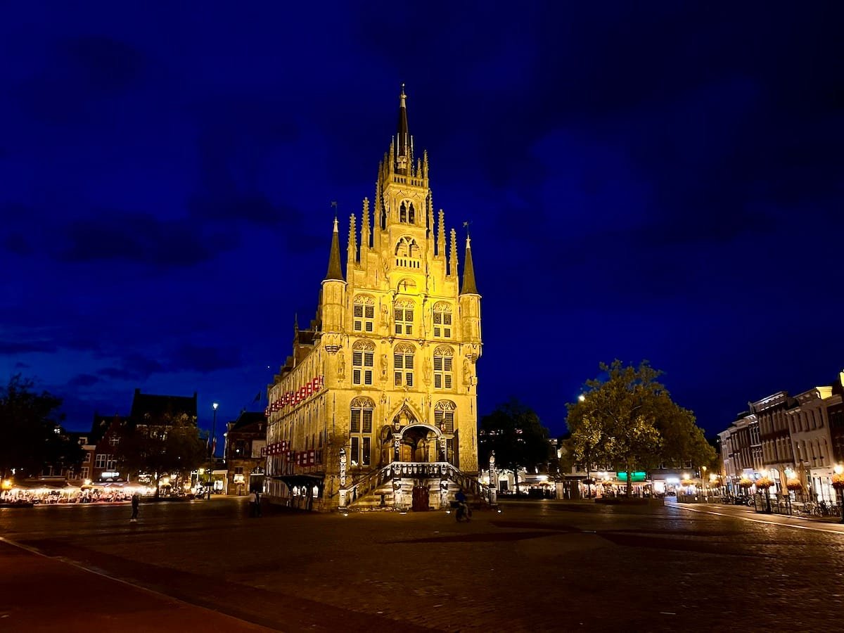 Um 9:30 Uhr haben wir Leiden verlassen. Es war stark bewölkt und der Fahrtwind war eisig! Nach dem Abpumpen des Schmutzwassertanks ging es weiter in die berühmte Käsestadt Gouda. Passend dazu gab es zum Abendessen Käsespätzle. Der riesige Marktplatz um das Rathaus, auf dem noch der traditionelle Käsemarkt stattfindet, sah in der Nacht echt cool aus.